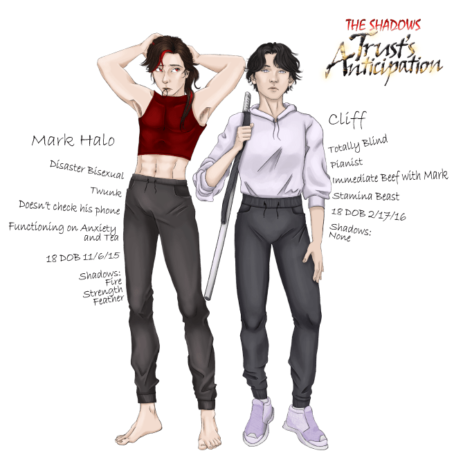 Mark spends the entire book fueled on anxiety, protective of Irwin whose health is going downhill, worrying over Kip while he’s so far away, and his only solace comes in working out. This causes him to cross paths with Cliff, who was injured by a Shadow as a child, blinding him, and he’s spent years searching for a way to heal his eyes.